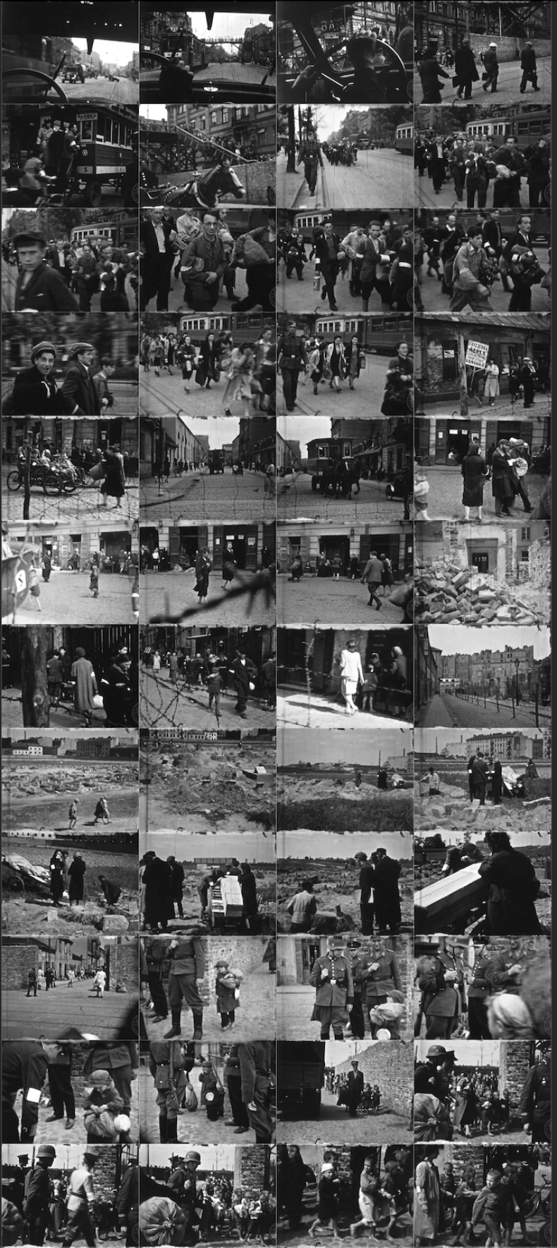 UFA-TONWOCHE 476/1939. PR: Universum-Film AG, Berlin. 35 mm, b/w, sound, 478 m. 17 min. Contains: Jews clearing rubble in Warsaw; excavation of a pit by Polish prisoners of war. Voice-over: "In Warsaw a maddened governmental and military clique incited the civilian population to resist, believing to be under British protection. The irresponsible city commandant thought he could stall the well-equipped German units with barricades and toppled trams. His absurd resolve is to blame for the rubble covering the streets of Warsaw today. Jews are made to participate in the clean-up. They are not afforded any chance to exploit the suffering of others through racketeering or profiteering." 7 m.